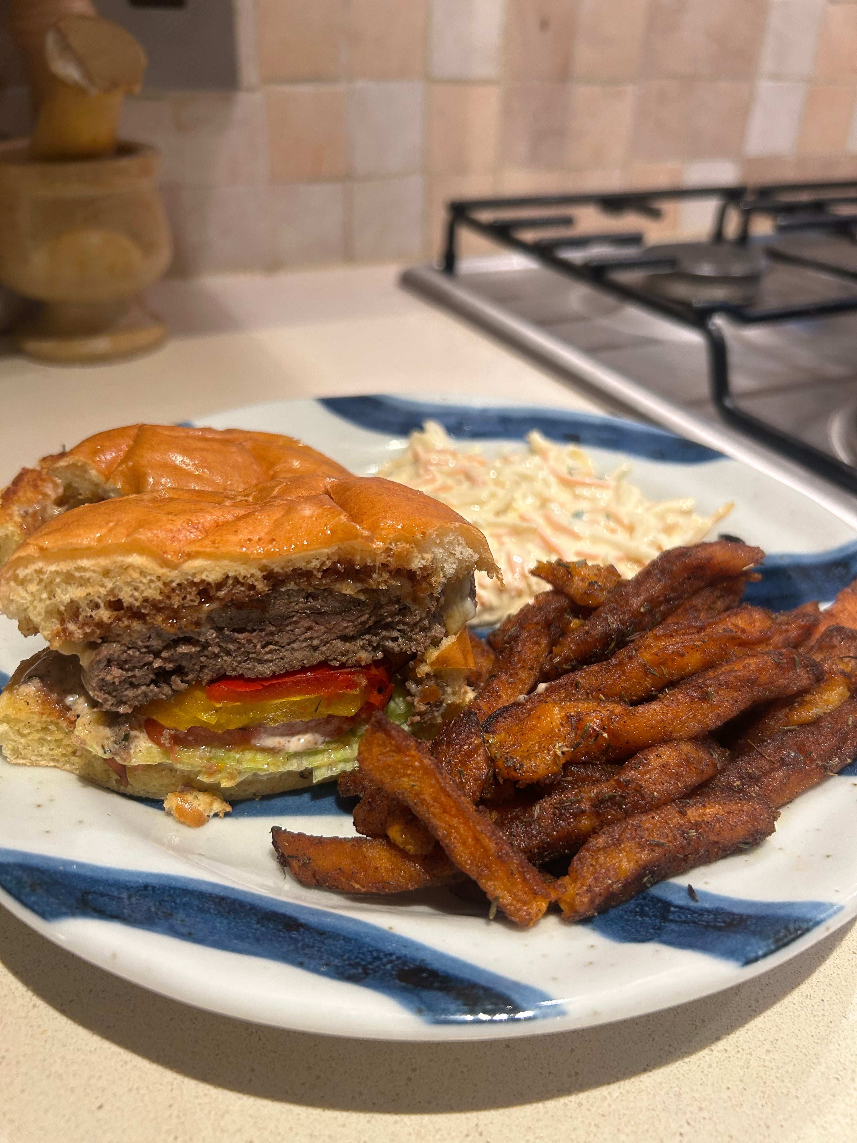 Juicy, spiced jerk chicken thighs crisped to perfection, served with fragrant Jamaican rice & peas infused with jerk seasoning, sweet caramelized plantains, and a vibrant coleslaw with a fresh herby twist. A Caribbean feast bursting with smoky, spicy, and sweet flavours! ๐ฏ๐ฒ๐ฅ๐๐๐