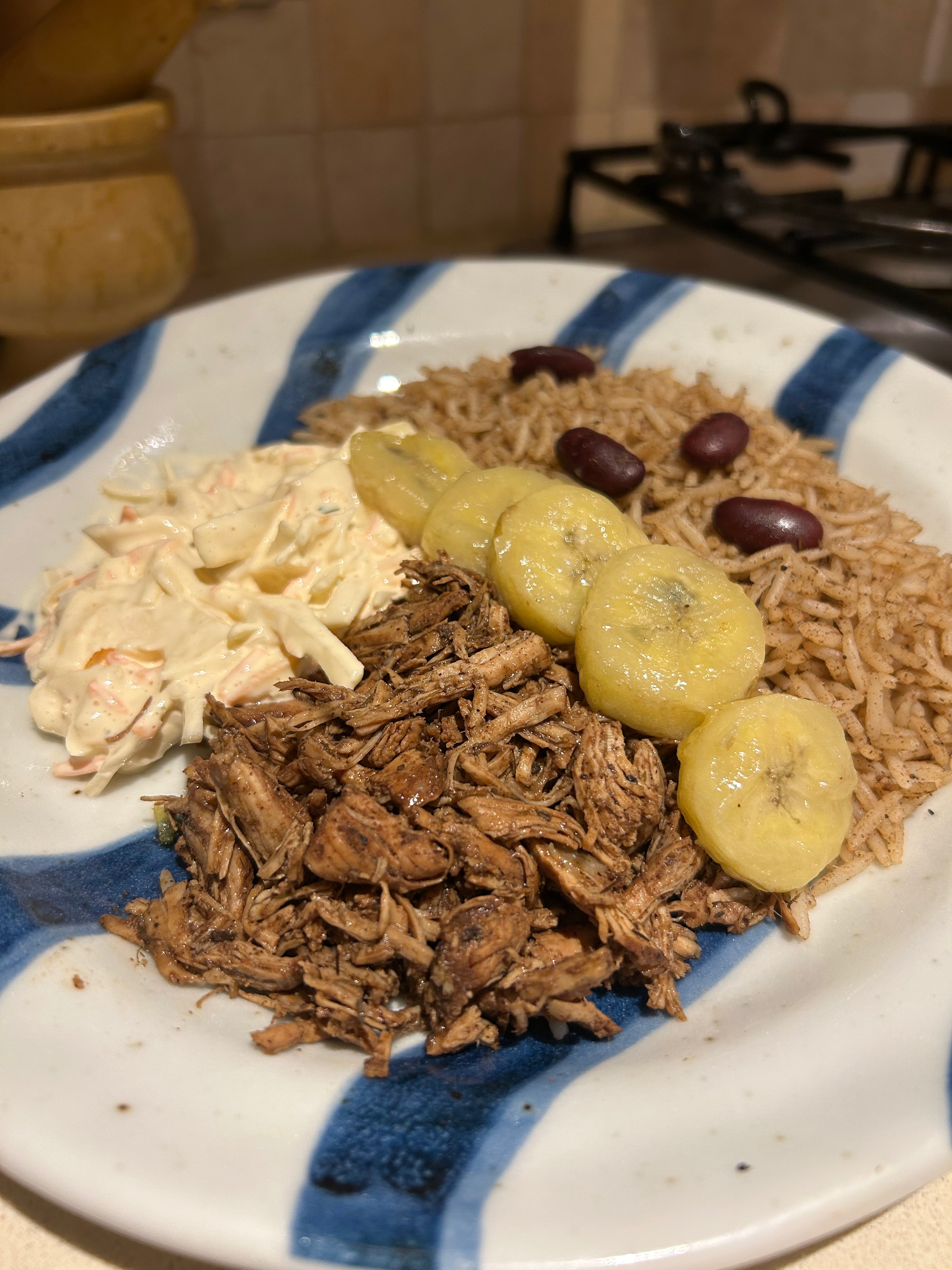 Tender, smoky pulled jerk chicken packed with bold Caribbean flavours, served with fragrant Jamaican rice & peas infused with jerk seasoning, sweet caramelized plantains, and a vibrant coleslaw with a fresh herby twist. A Caribbean feast bursting with smoky, spicy, and sweet flavours! ๐ฏ๐ฒ๐ฅ๐๐๐
