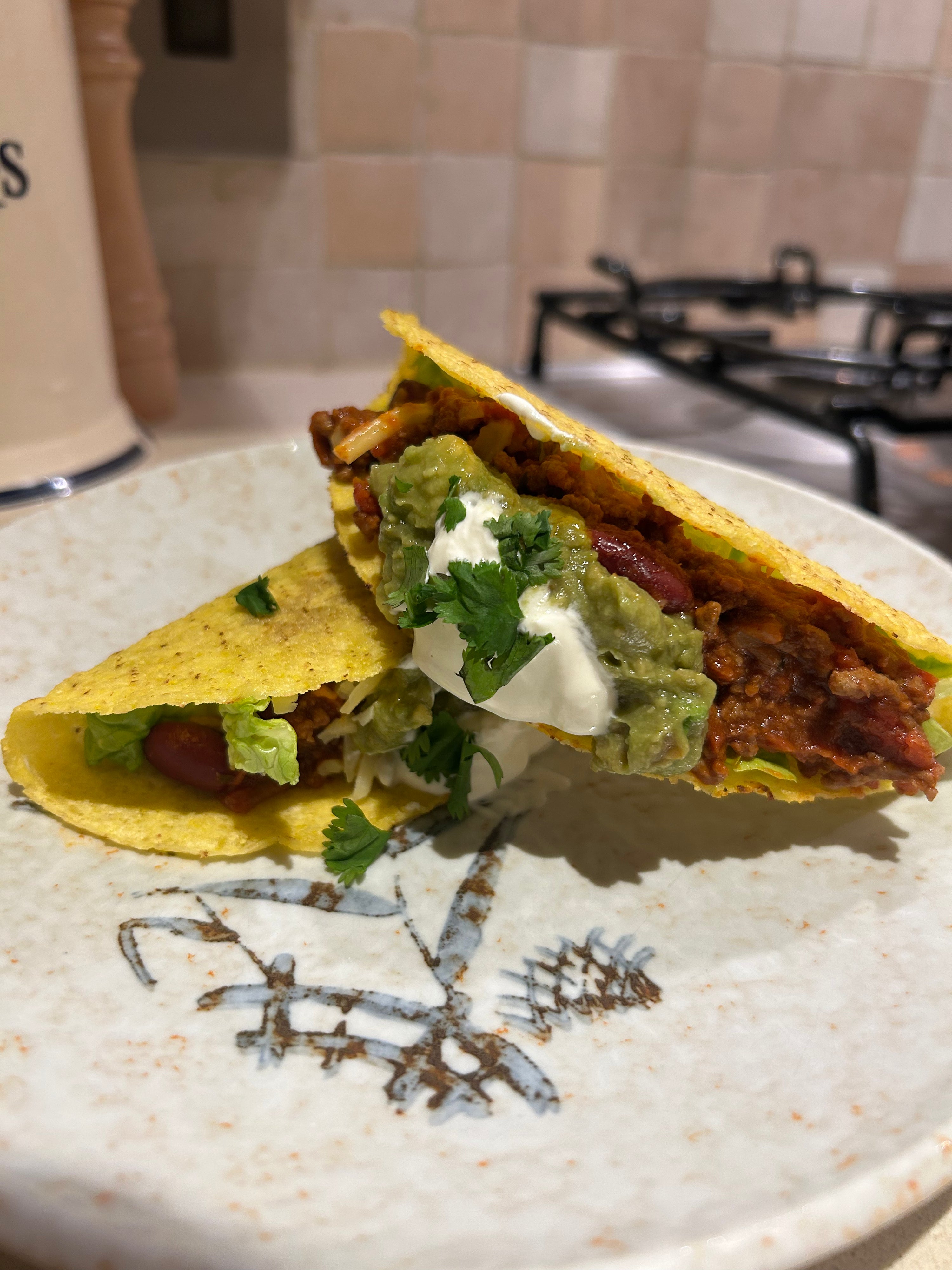 Crunchy hard-shell tacos loaded with flavourful Mexican-spiced beef chili, melted cheddar, creamy guacamole, and cool sour cream. A satisfying, flavor-packed bite every time! 🌮🧀🔥