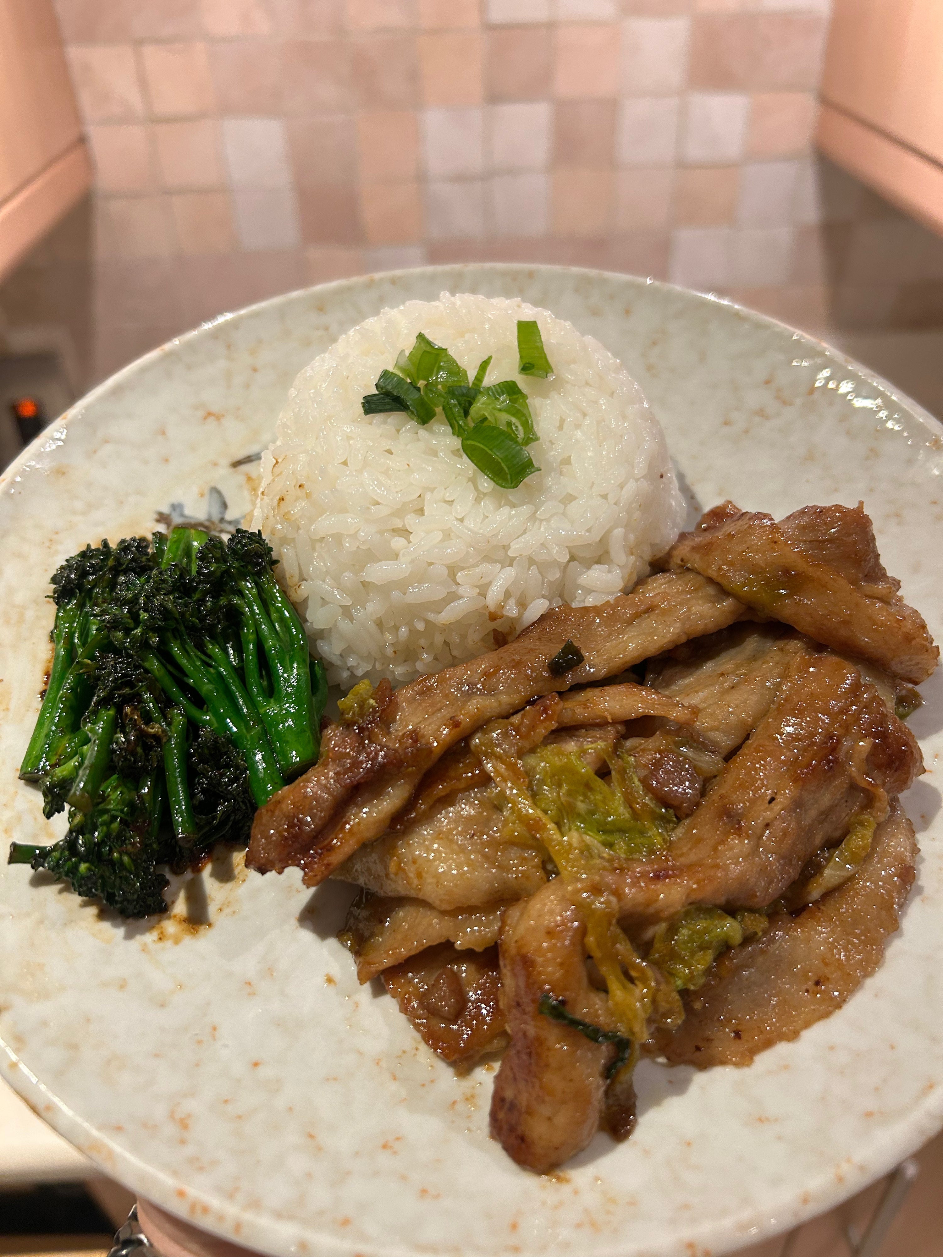 Serve 🍽️: Plate the Japanese rice and garnish with spring onion, then add the miso ginger pork belly beside it. Serve the broccoli on the side.