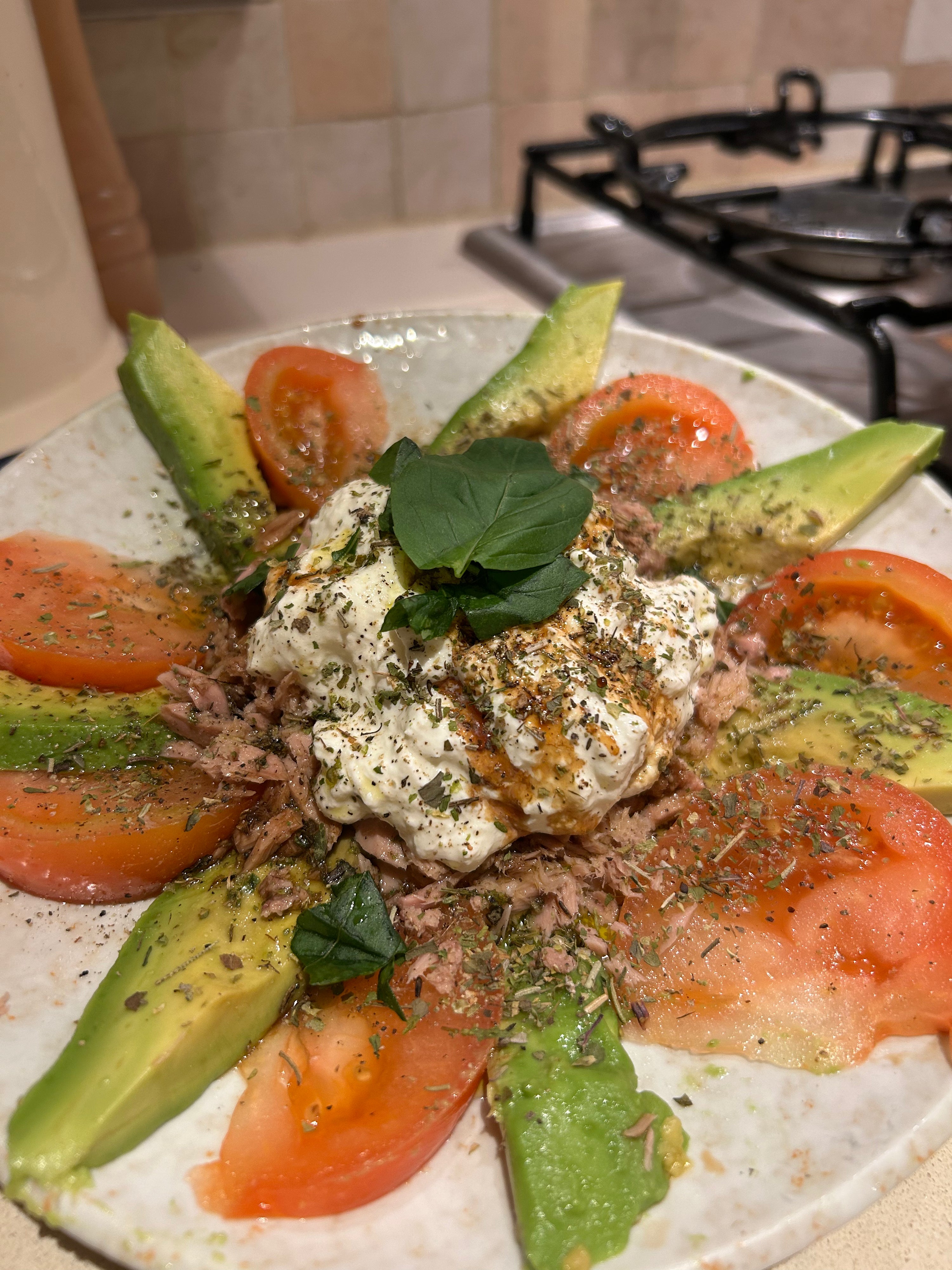 A fresh and vibrant Tricolore salad featuring juicy tomatoes, creamy avocado, and a rich burrata heart, elevated with tender tuna, fragrant Italian herbs, and a drizzle of olive oil and balsamic glaze. A simple yet indulgent Italian-inspired dish. 🍅🥑🐟